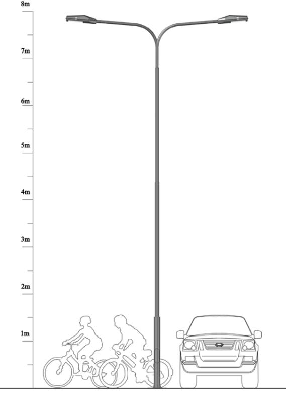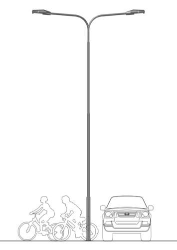 TROSEGMENTNI ČELIČNI STUBOVI objedinjuju grupaciju funkcionalnih stubnih nosča, visine od 5,0 do 12,0 m., izvedenih od različitih čeličnih cevi kružnog preseka, raspoređenih u vidu dvosegmentnog stabla i postamenta, međusobno usaglašenih dimenzija u skladu sa konstruktivnim i estetskim zahtevima. Postament stuba se izrađuje sa otvorom, dimenzije 300x100 mm, za smeštanje RP ploče, osigurača i vijka za uzemljenje i oprema odgovarajućim poklopcem sa nerđajućim vijcima.